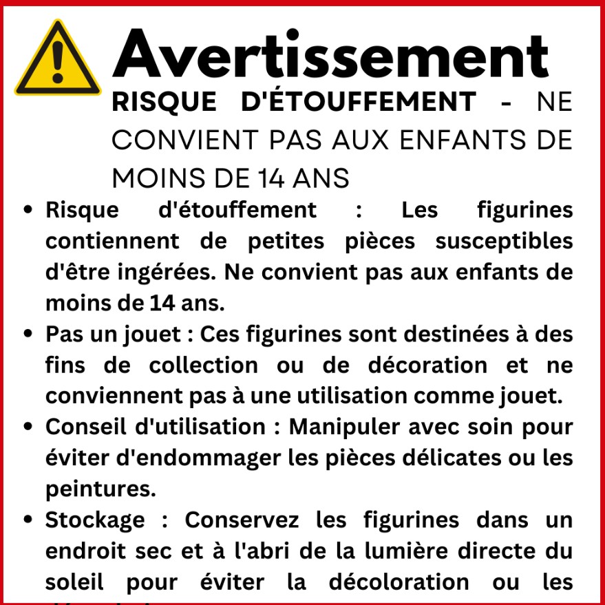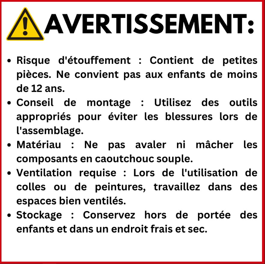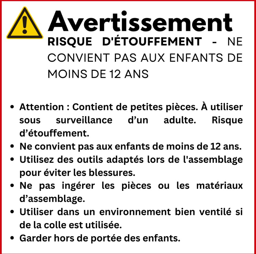 - Petites pièces : Les maquettes peuvent contenir de petites pièces qui présentent un risque d’étouffement pour les jeunes enfants. Il est donc crucial de les tenir hors de leur portée.