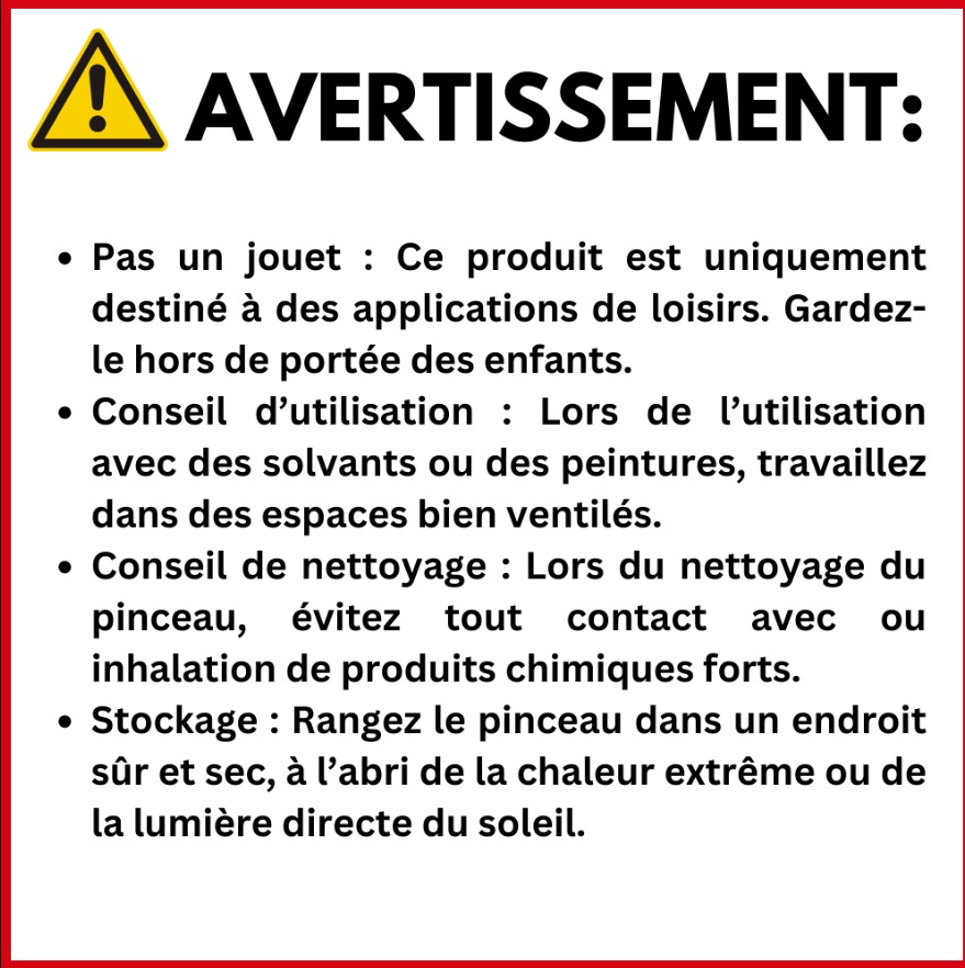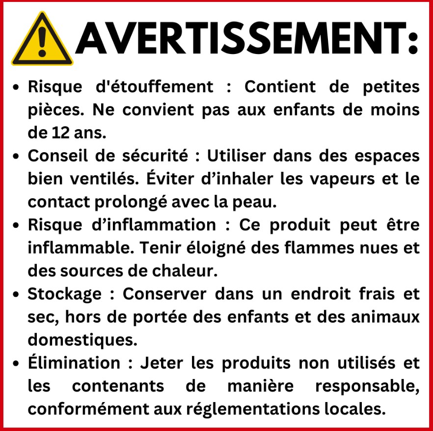 - Tenir hors de portée des enfants : Ne convient pas aux enfants de moins de 12 ans. Conservez les peintures hors de portée des enfants.